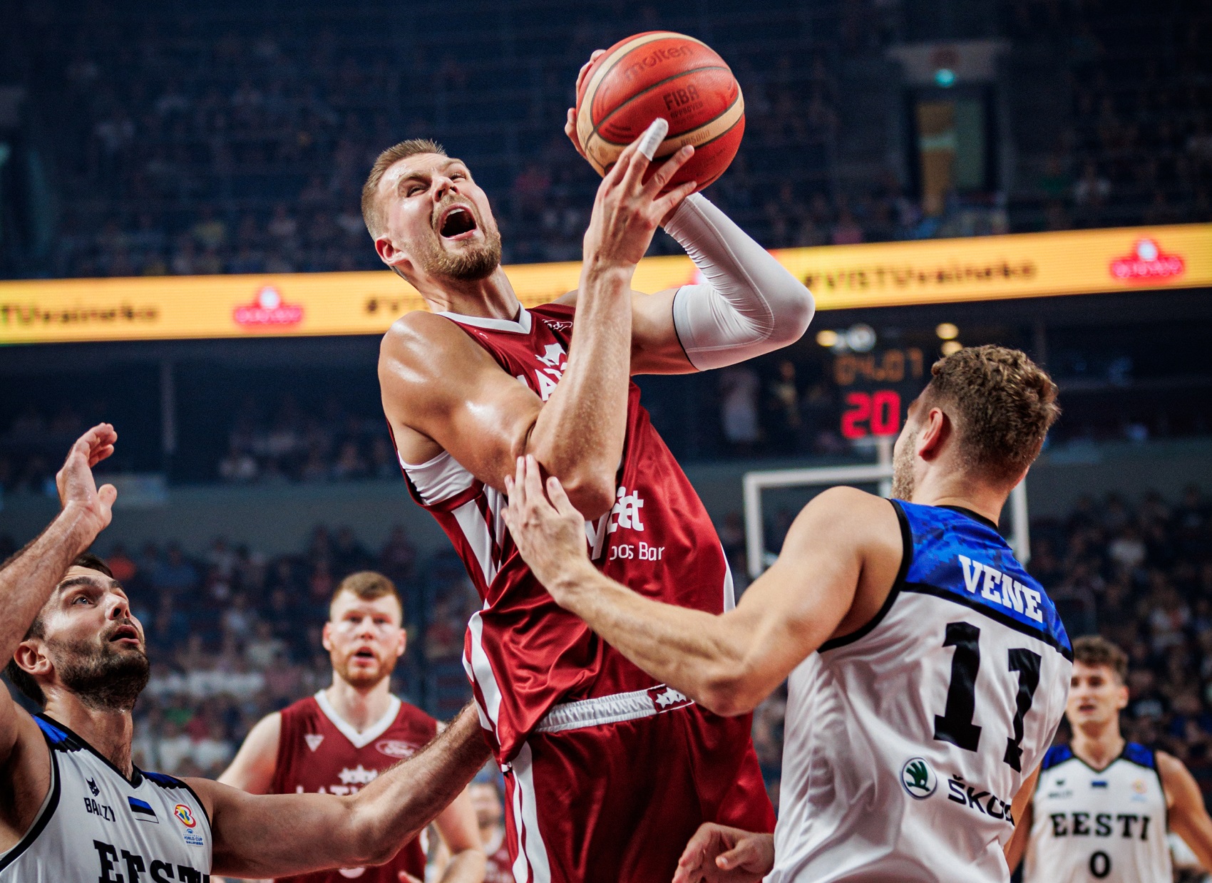 Kristaps Porziņģis valstsvienībā atgriezās ar 18 punktiem un 7 atlēkušajām bumbām un 7 izprovocētām piezīmēm, Rodionam Kurucam 16+7 atl., Rihardam Lomažam 13 + 5 piespēles.